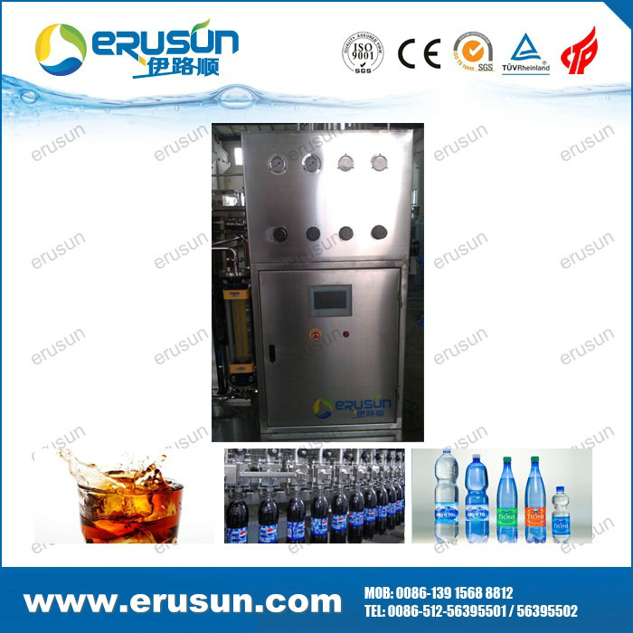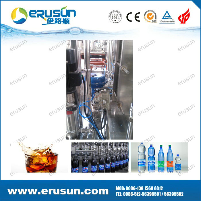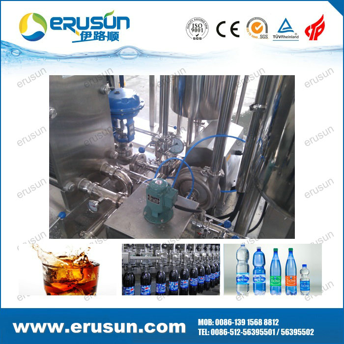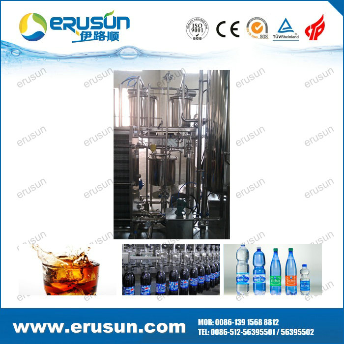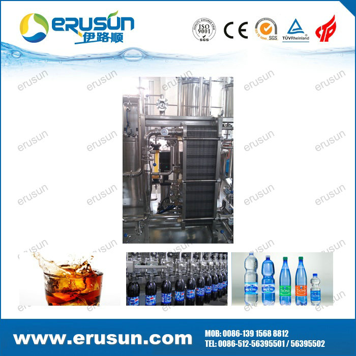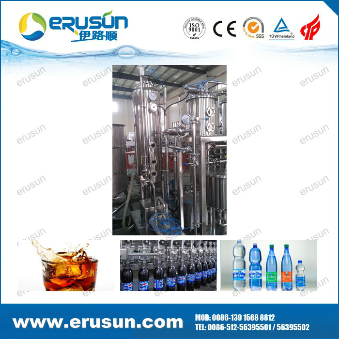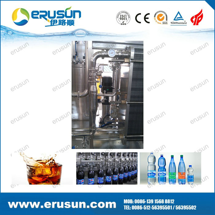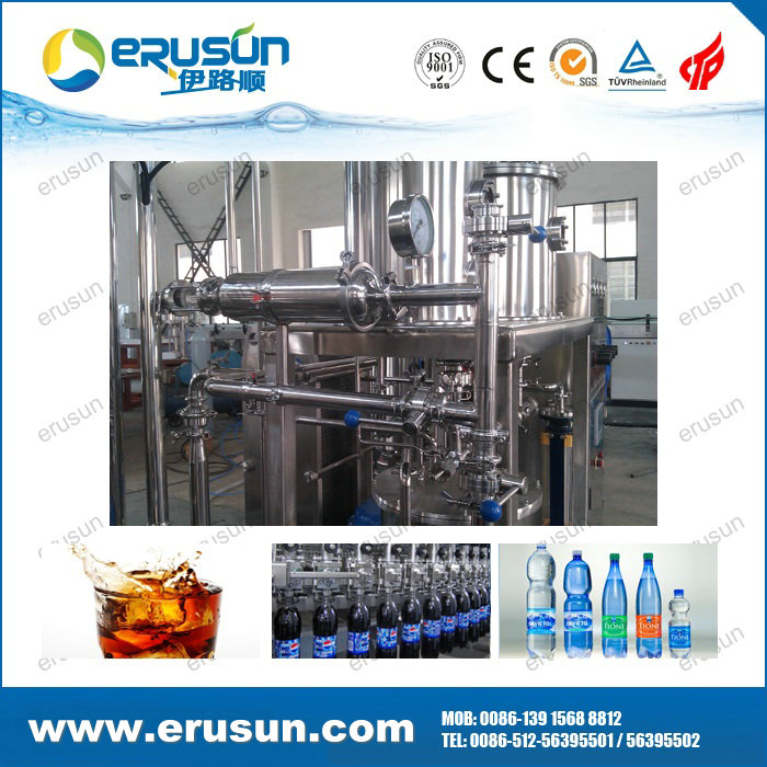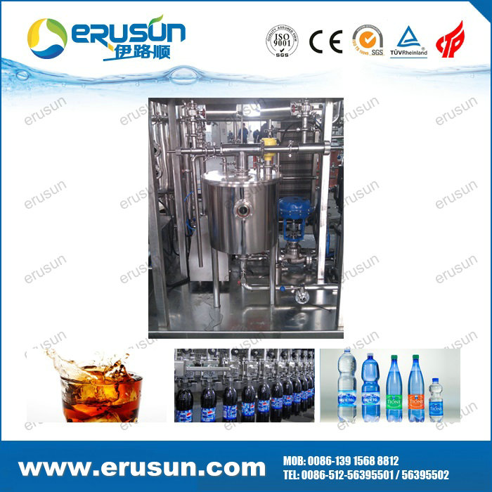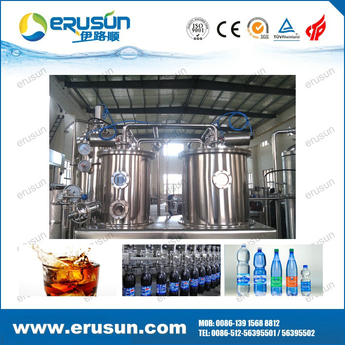 The carbonator is to mix the syrup, water and carbon dioxide together. The equipment is made of degasser, sugar and water mixer, plate type heat exchanger, carbonized tank, pump and pipes. The degassed water is mixed with syrup at the certain ratio, and cooled to 0-2℃ through plate type heat exchanger, than fully contact with the carbon dioxide in the carbonized tank, realizing carbonation.