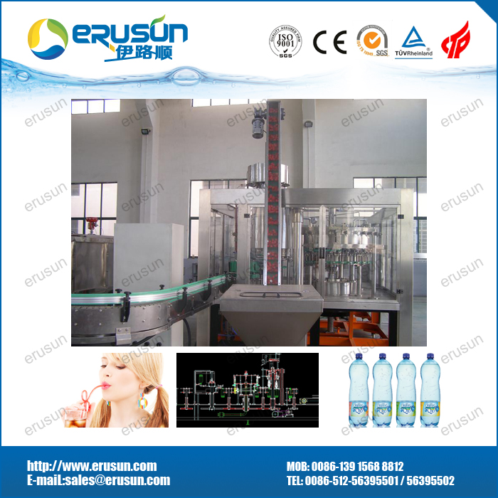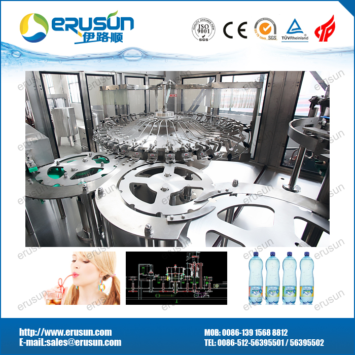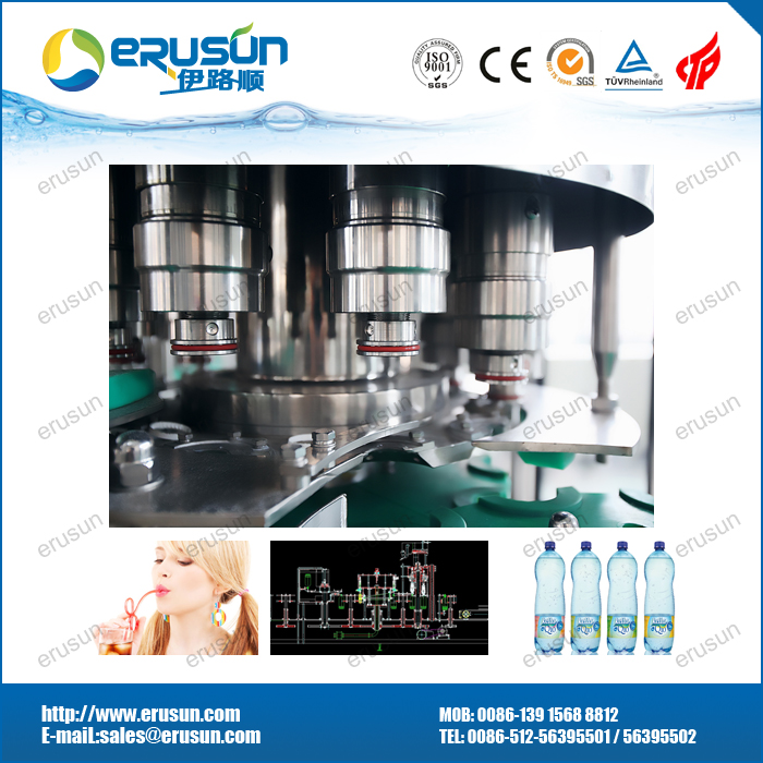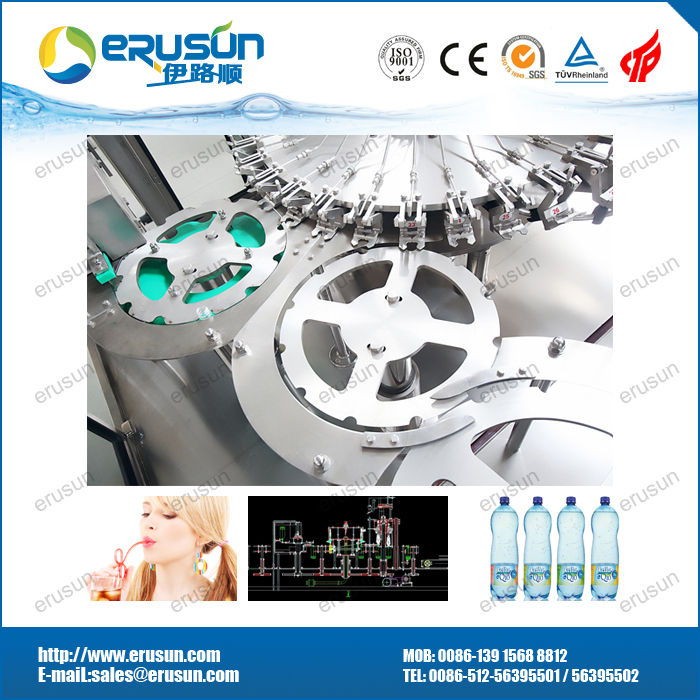 技术特点: 采用风送道与进瓶拨轮直连技术和全程卡瓶颈(neck handling)传输技术。 高速线采用瓶夹传输技术,瓶型变化更为自由,机组内部工作台面更为简洁。 三合一机组内部一次完成洗瓶、灌装、封盖三道工序,瓶子磨损小、传动准确平稳、瓶型更换便捷。 特殊设计的全不锈钢冲瓶机瓶夹结实耐用,不接触瓶口螺纹部位,避免瓶口二次污染。 承压式液缸,高速线采用环形液缸。 高速大流量等压灌装阀,灌装速度快,液面准确无液损。 与液体接触的零部件全部采用优质不锈钢材料或食品级工程塑料,电气系统多数选用进口元件,符合国家食品卫生标准。 出瓶拨轮瓶底托板采用螺旋下降方式,变换瓶形无须调整出瓶输送链高度。 设备主要组成部分: 三合一主机由洗瓶机、灌装机、旋盖机、机架、封窗、主电机及传动系统、瓶传输送、理盖器及电气控制系统等部件组成。 洗瓶机的翻转机构,主要由分水盘、洗瓶夹、上转盘、导轨、防护罩、喷水装置、接水盘组成。 灌装机构,主要由灌装桶、灌装阀、导轨、提升装置、卡瓶升降装置等组成。 封盖机构,由理盖器、落盖导轨及旋盖机三大部件组成。 辅助(或选配)设备有冲瓶水回流罐、进瓶风道和出瓶链,此外还可按客户要求配置人工上瓶平台(或理瓶机)、多排差速链式人工排瓶台、自动上盖机等。 整机可拆成三大模块,出瓶输送链高度可调;瓶通过风道,由星轮夹瓶头先后送至洗瓶机、灌装机,旋盖机,最后经出瓶输送链送出。在整个过程中设有多处卡瓶、缺瓶、缺盖、过载等保护报警装置,性能可靠,工艺流程科学,食品卫生条件满足食品卫生国家标准,生产自动化程度高,操作简便。