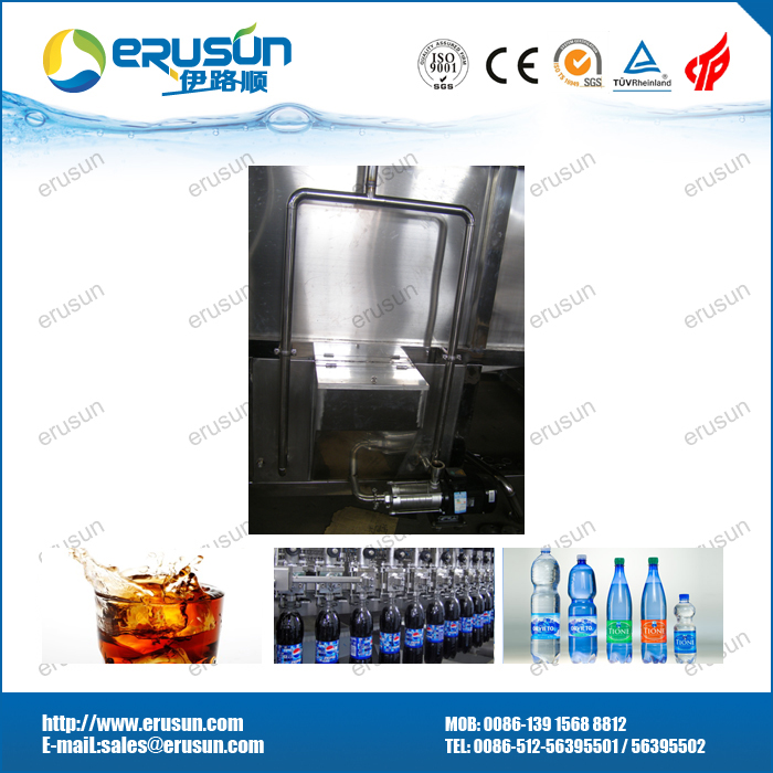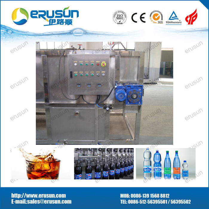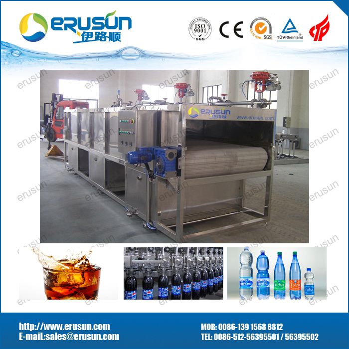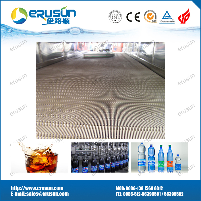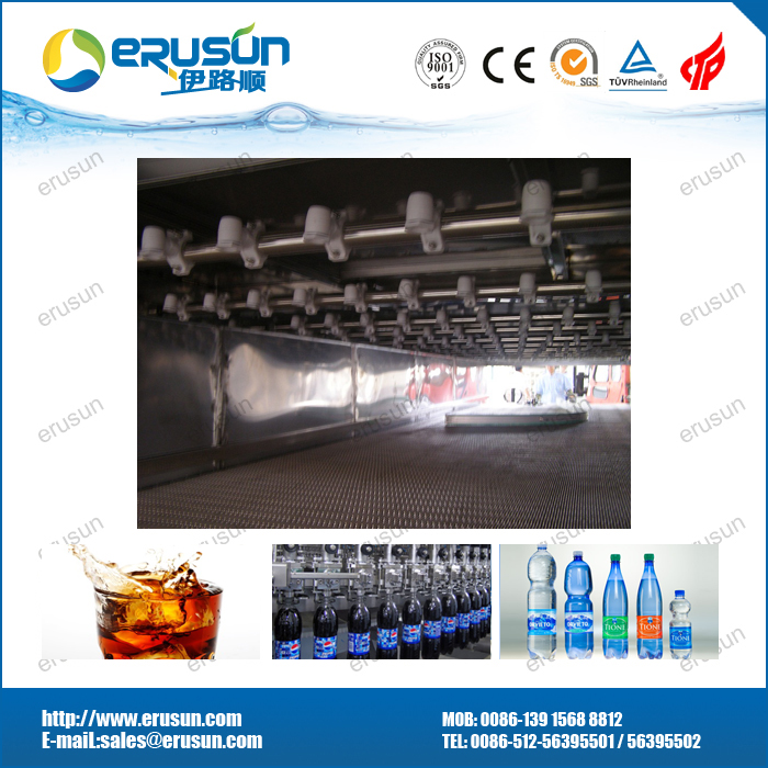 由于碳酸饮料采用低温灌装(2℃-5℃),而夏季的室温远高于此 ,在这样的环境中 ,空气中的水分极易在瓶身外表面冷凝结露,给后续包装和操作带来不便,如贴标 。特别地 ,如果采用纸箱包装,则露水浸湿纸板,可造成严重破损 。所以在灌装机后必须设置一台温瓶机 ,对瓶身加热至室温。温瓶机是一台隧道式喷淋设备,通过循环喷淋热水的热交换方式加热瓶身,常设三个温区(也可设计更多的温区) ,分段加热后 ,饮料中心的温度达到室温,通常设计为30-35℃。温瓶机主要由机架、输送链板、传统系统、储水槽、循环泵、喷淋装置、加热装置及管路组成。加热器可采用蒸汽源的板式换热器或电加热器两种形式。